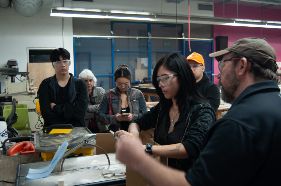 A UNLV student learns how to cut tile on a QEP Katana SR-31 Tile Cutter