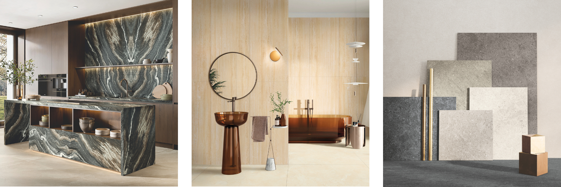 Images from left to right: Cristacer’s Arkemia Collection, AlysEdwards Tile and Stone Barely There