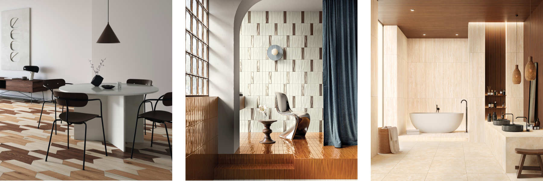 Images left to right: MILE®stone, with its geometric Shapes collection, Cerasarda’s PORTO ROTONDO inspired by Sardinia’s landscapes, KTL Ceramica’s Verona